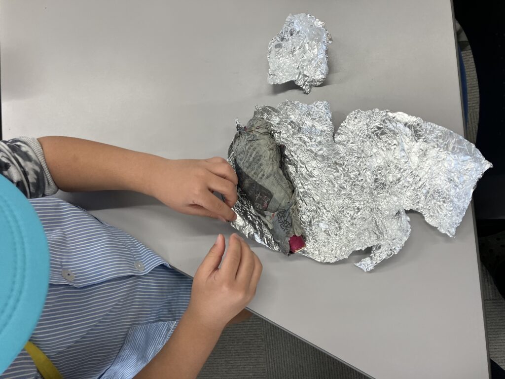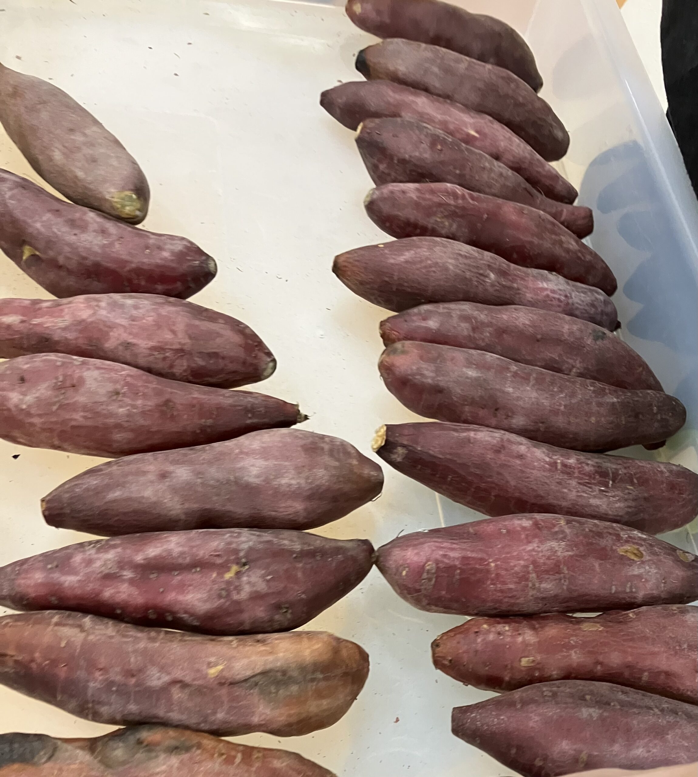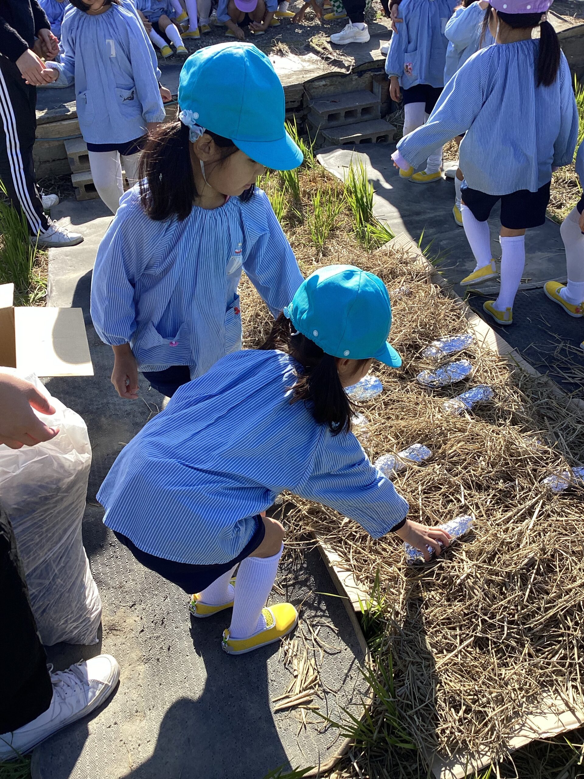 濡れた新聞紙とアルミホイルで包んださつまいもを、保育園の畑で焼きました。甘くてほくほくのやきいもが完成しました。