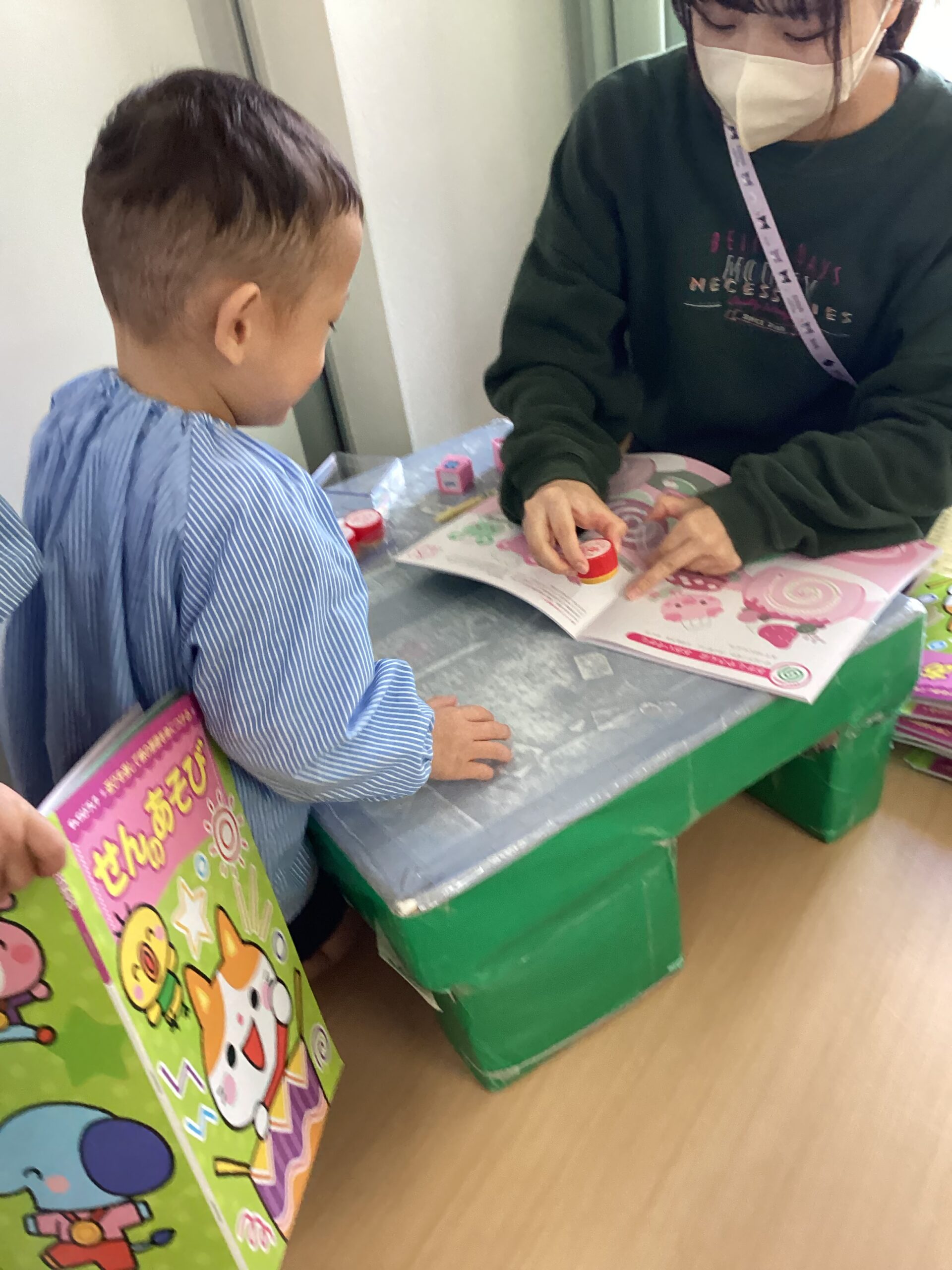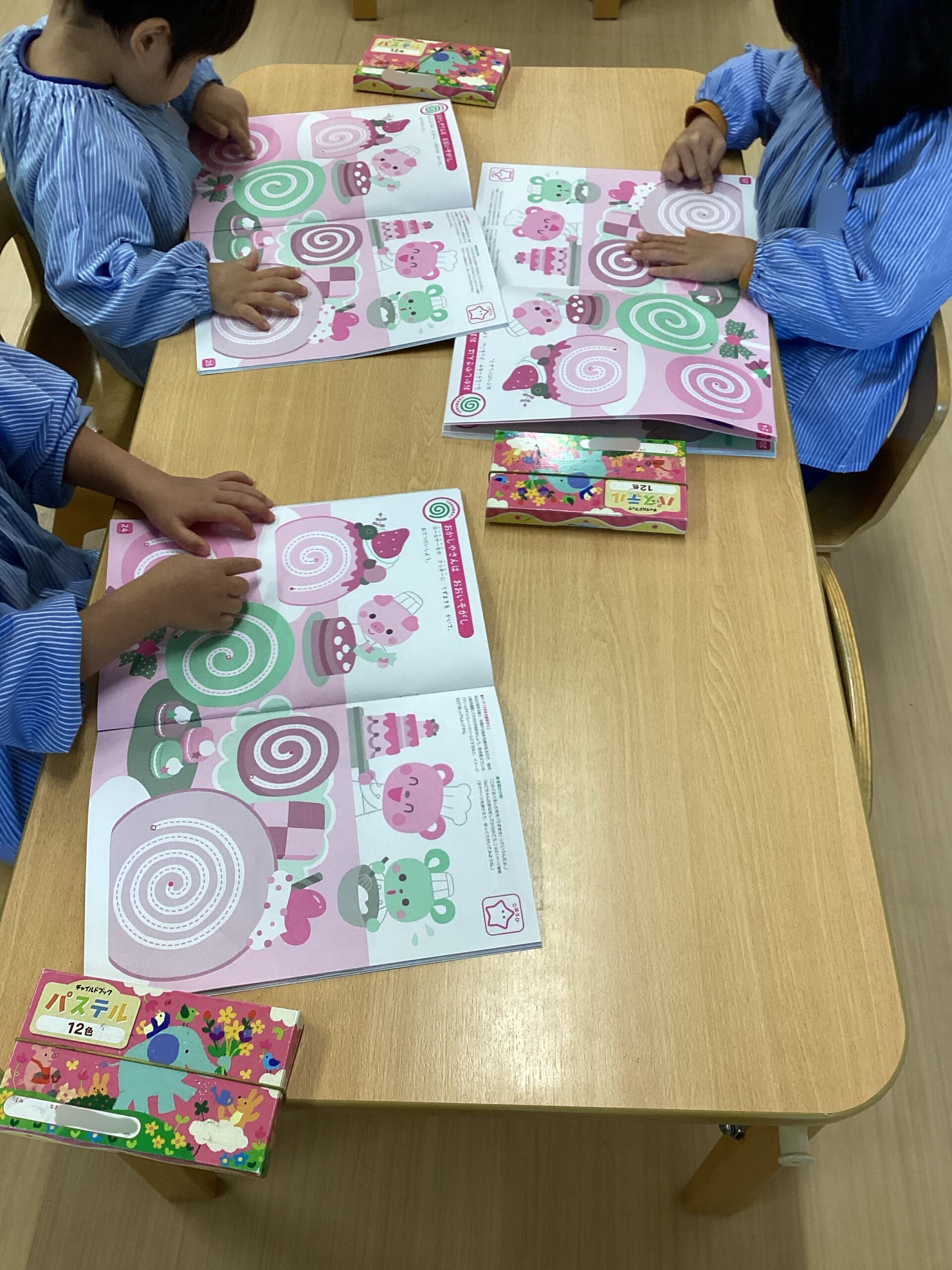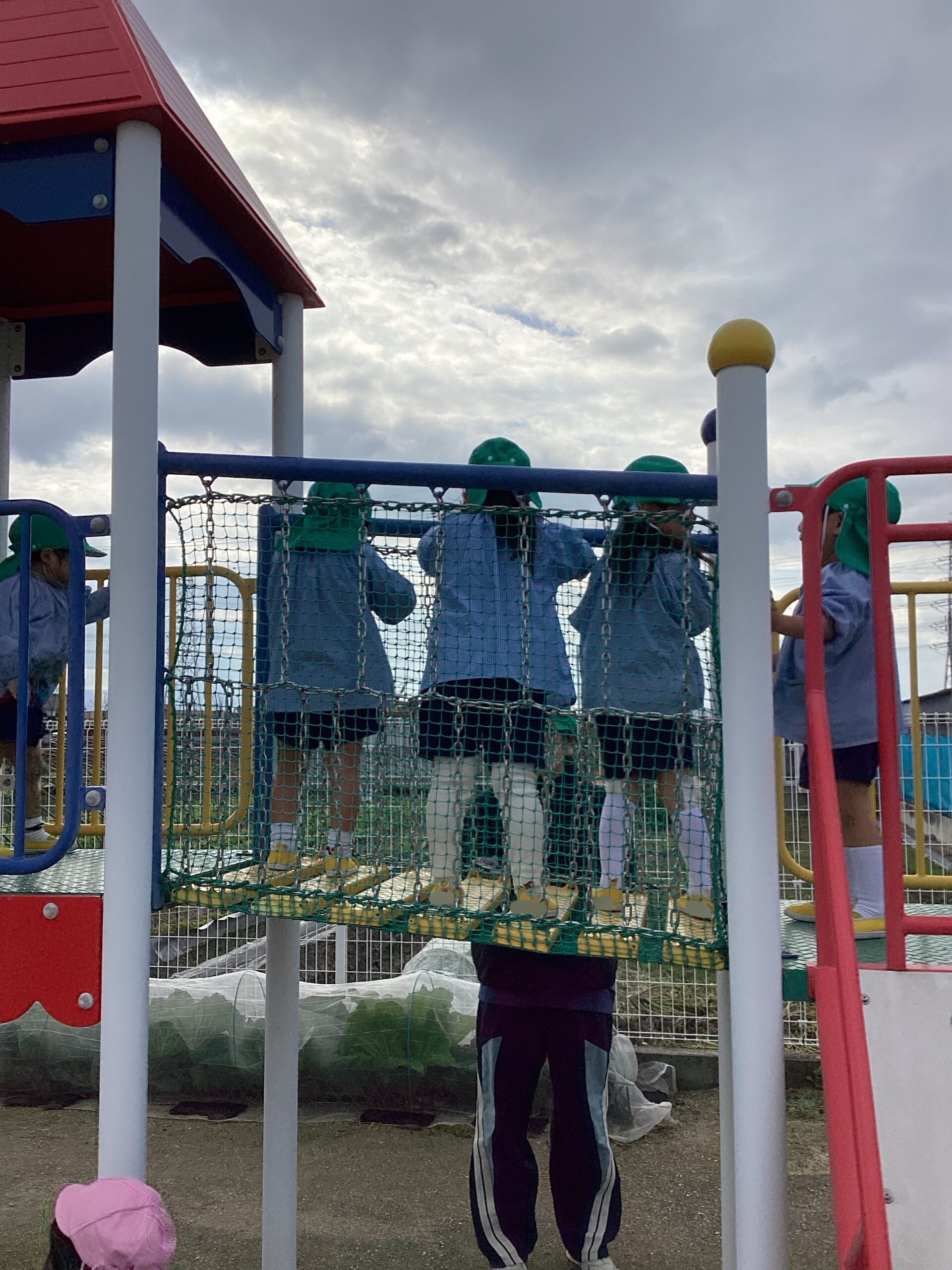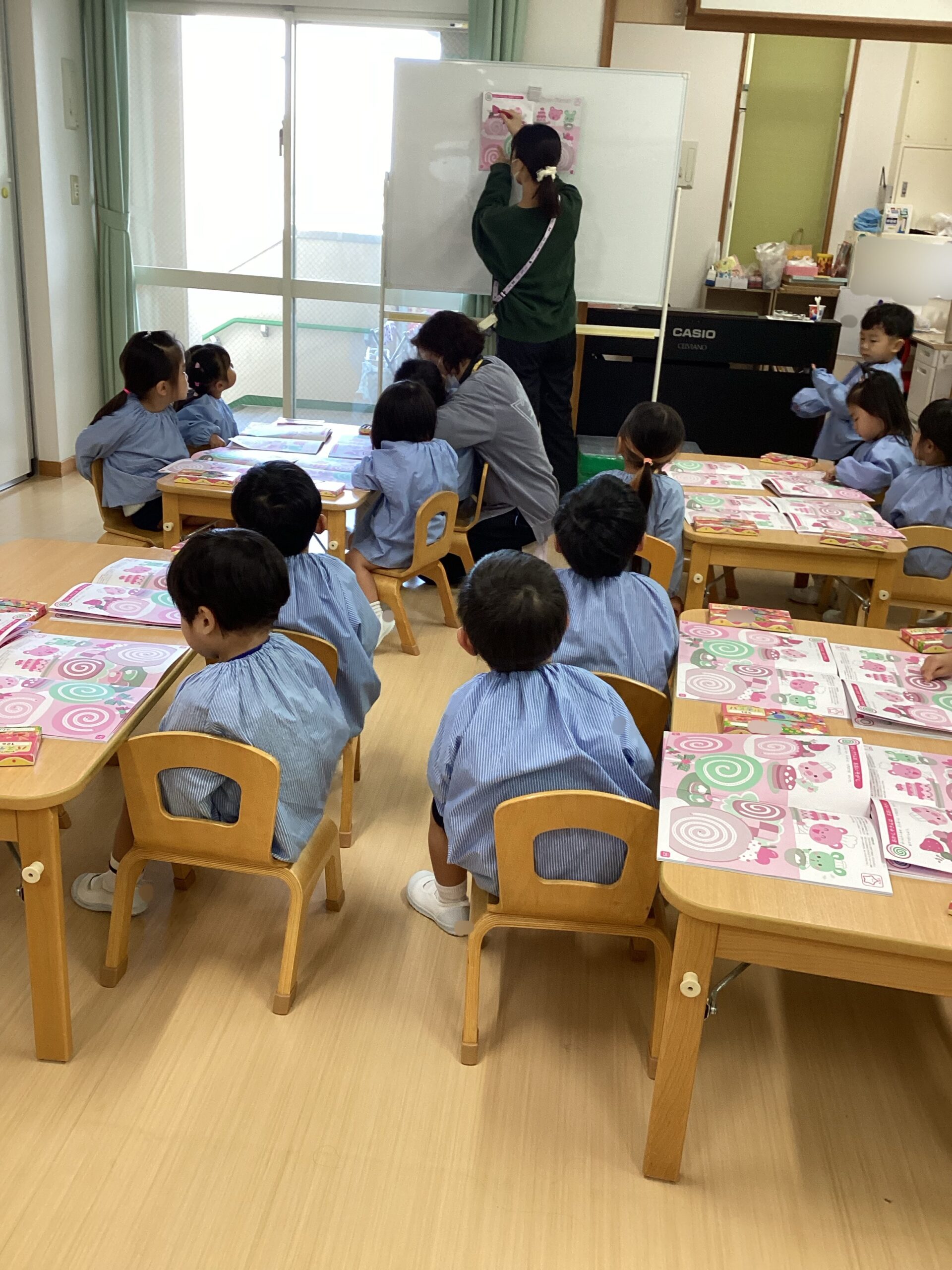 ぱんだぐみさんは、園庭で遊んだり、ワークをしました。園庭では、先生と追いかけっこを楽しむ姿も見られました。