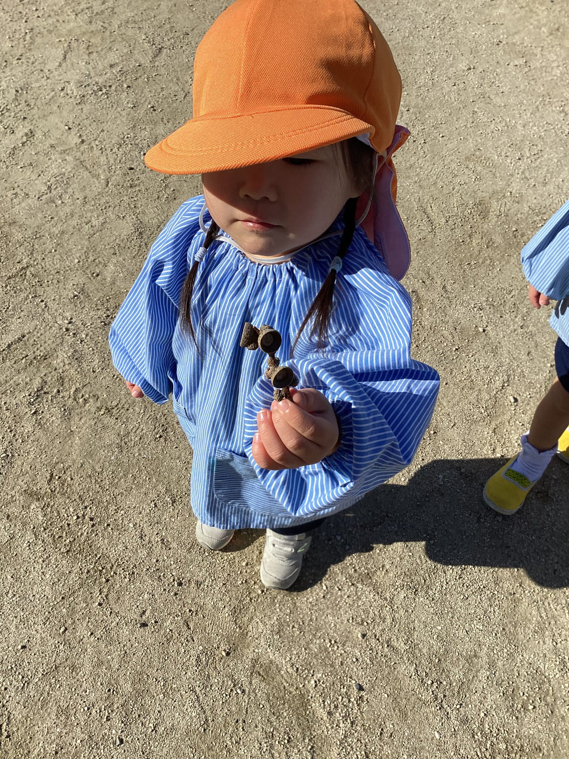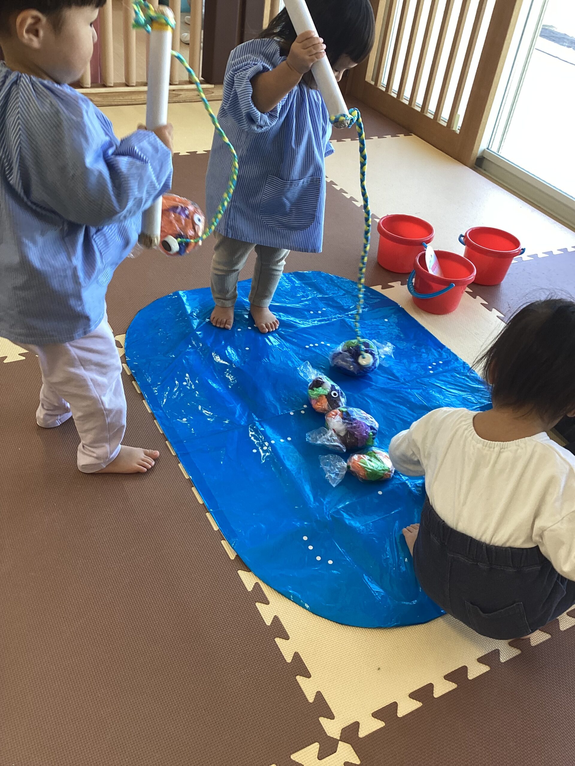 うさぎぐみさんは、どんぐりや魚釣りで遊びました。どんぐりに興味津々でした。