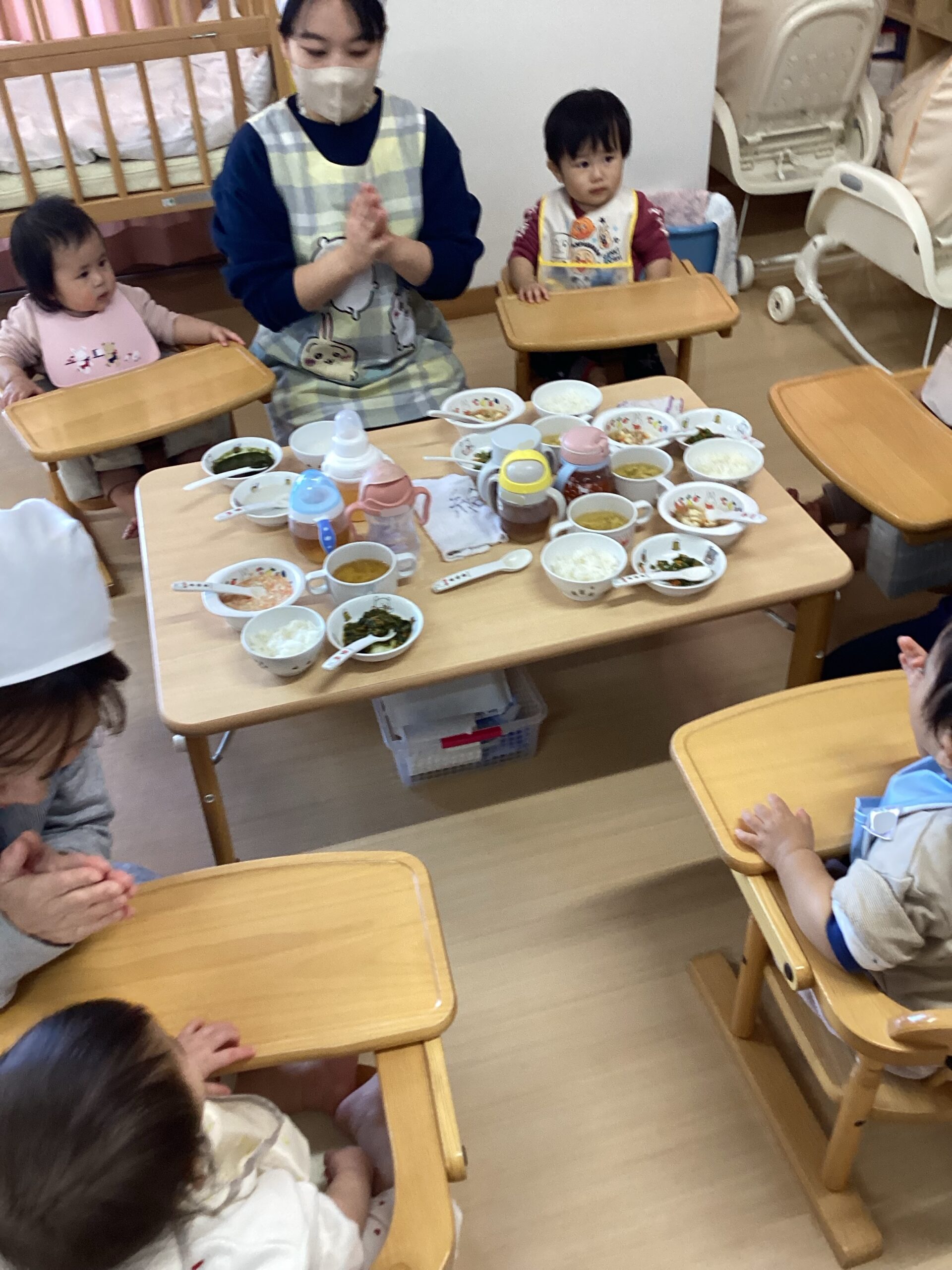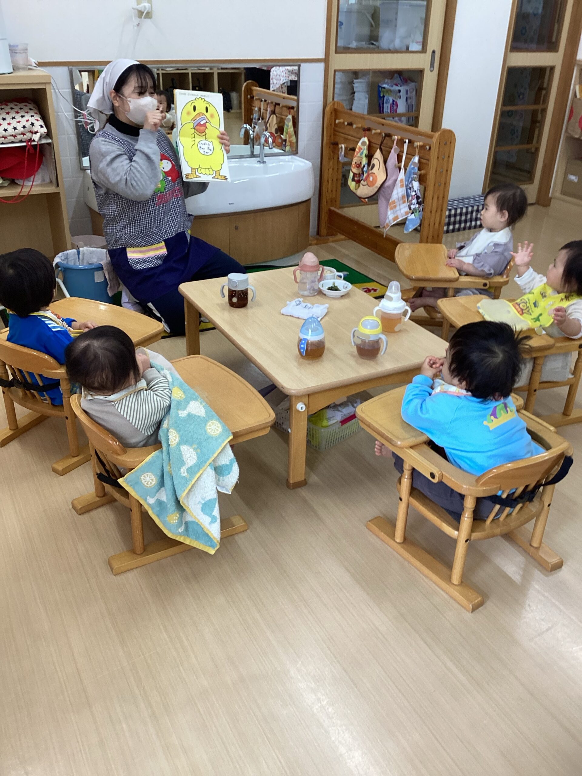 りすぐみさんは、給食の前の様子です。先生に絵本を読んでもらい嬉しそうでした。