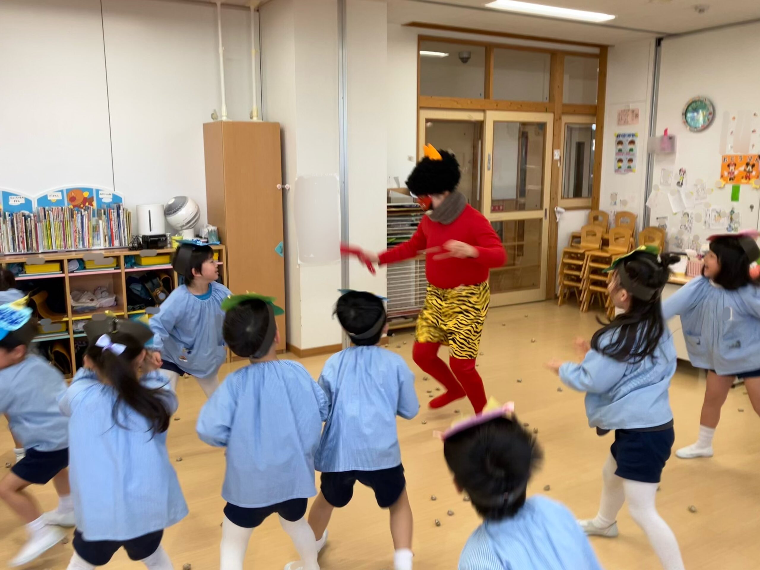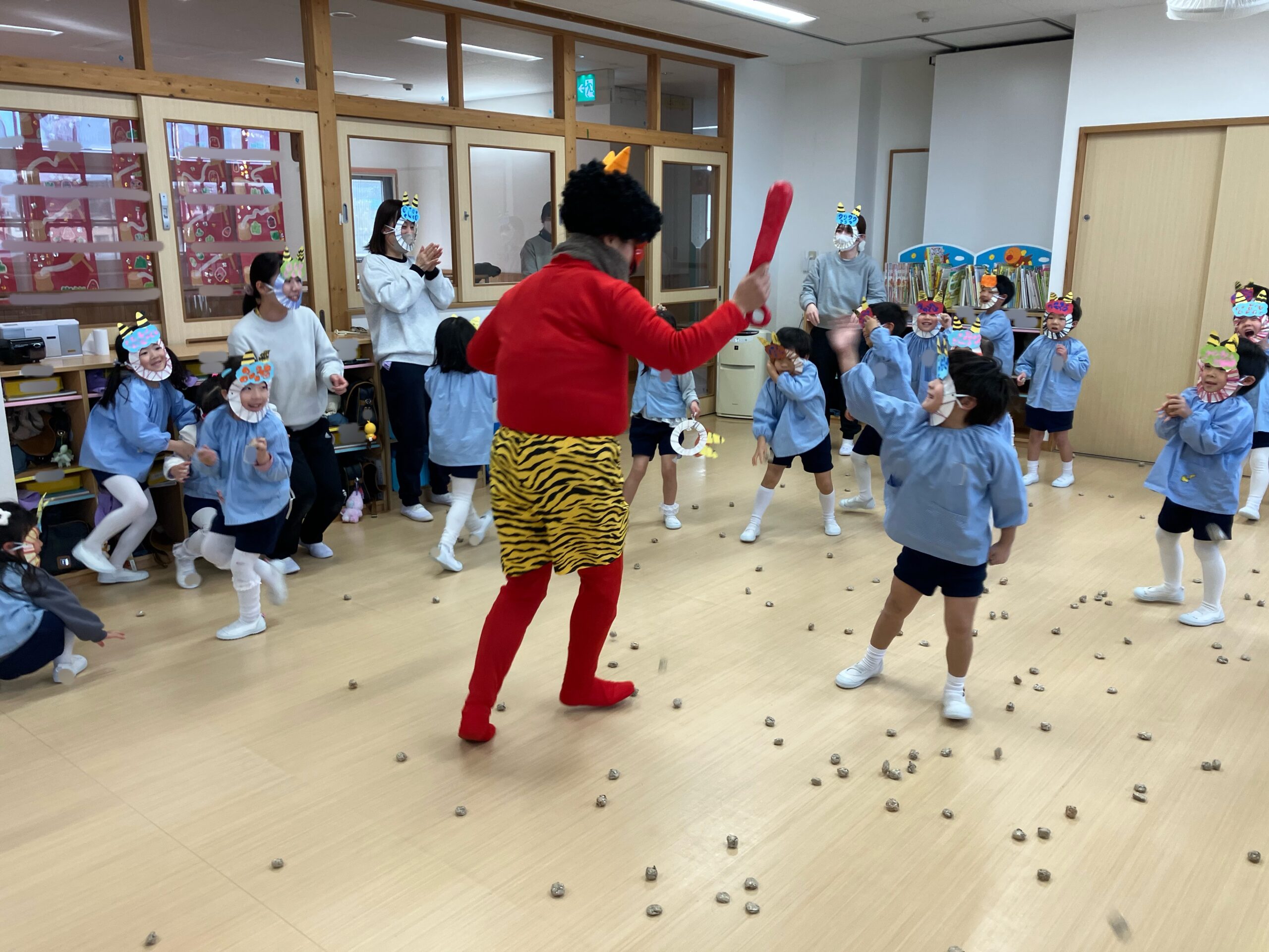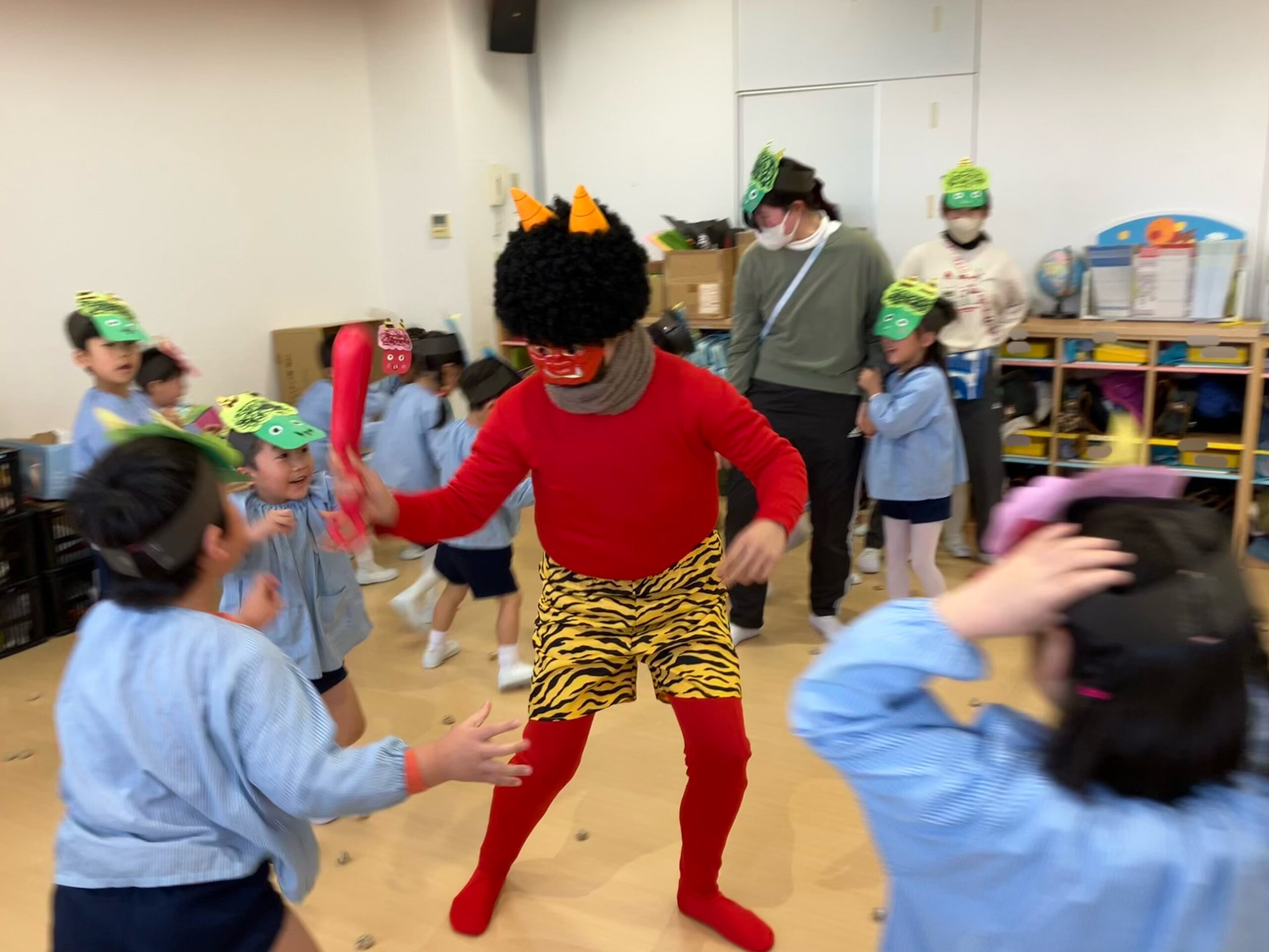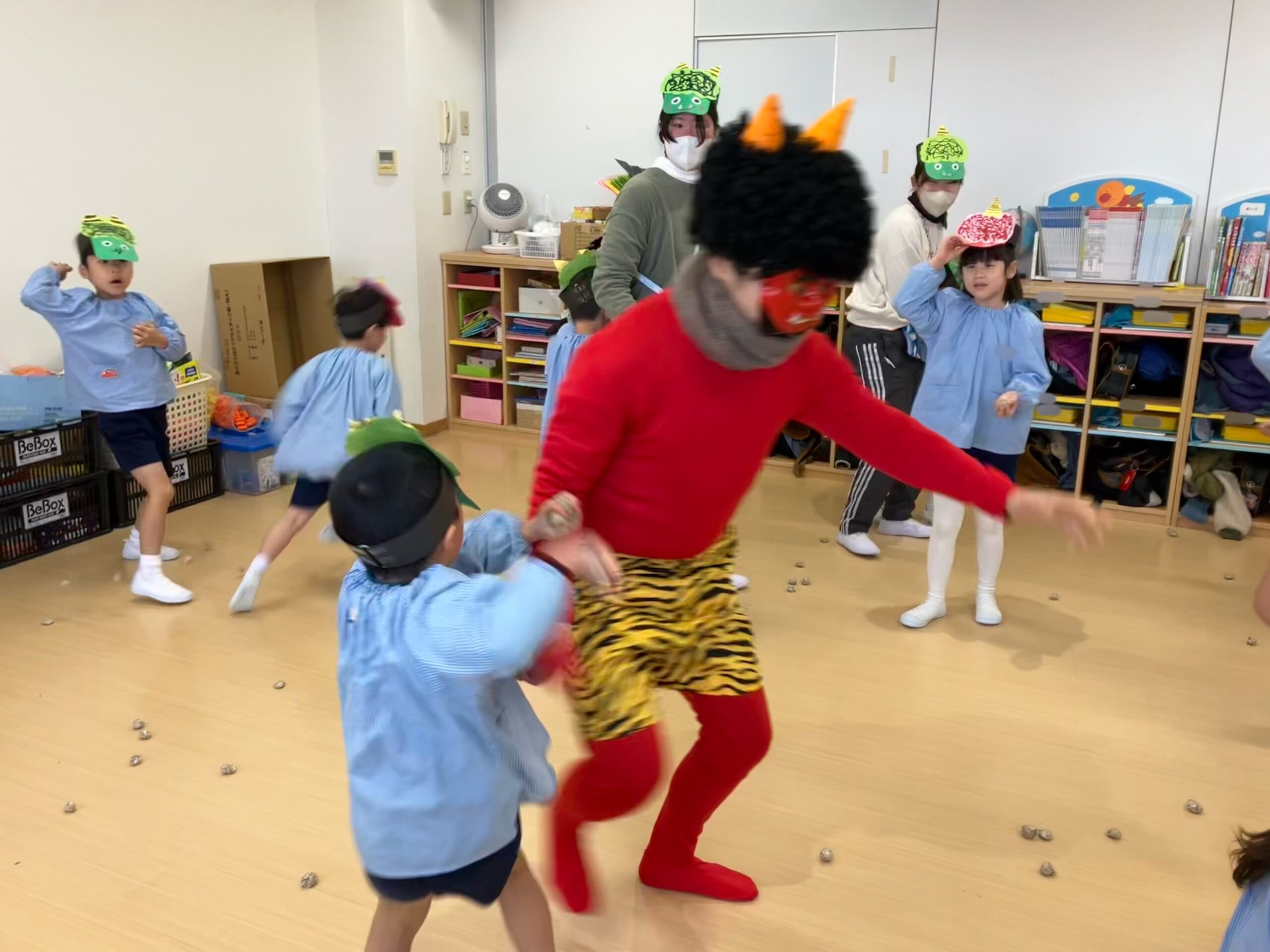 「おにはそと!ふくはうち!」と元気いっぱい豆まきをしているところに、鬼がやってきました。