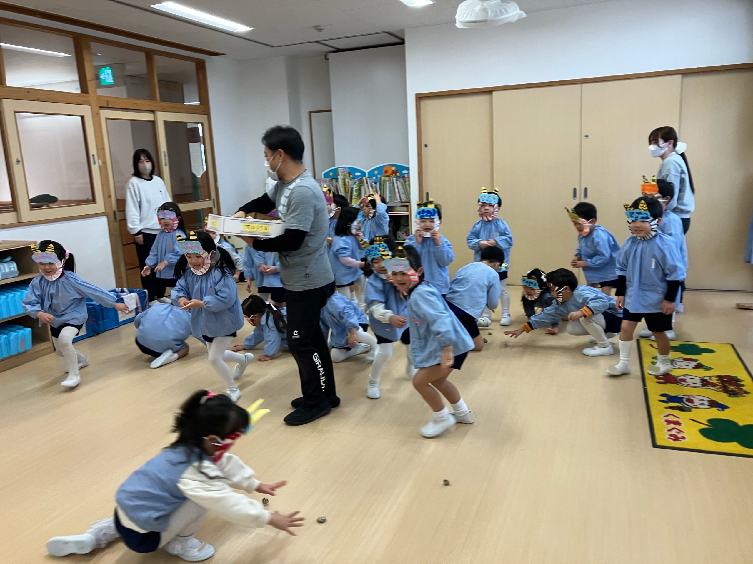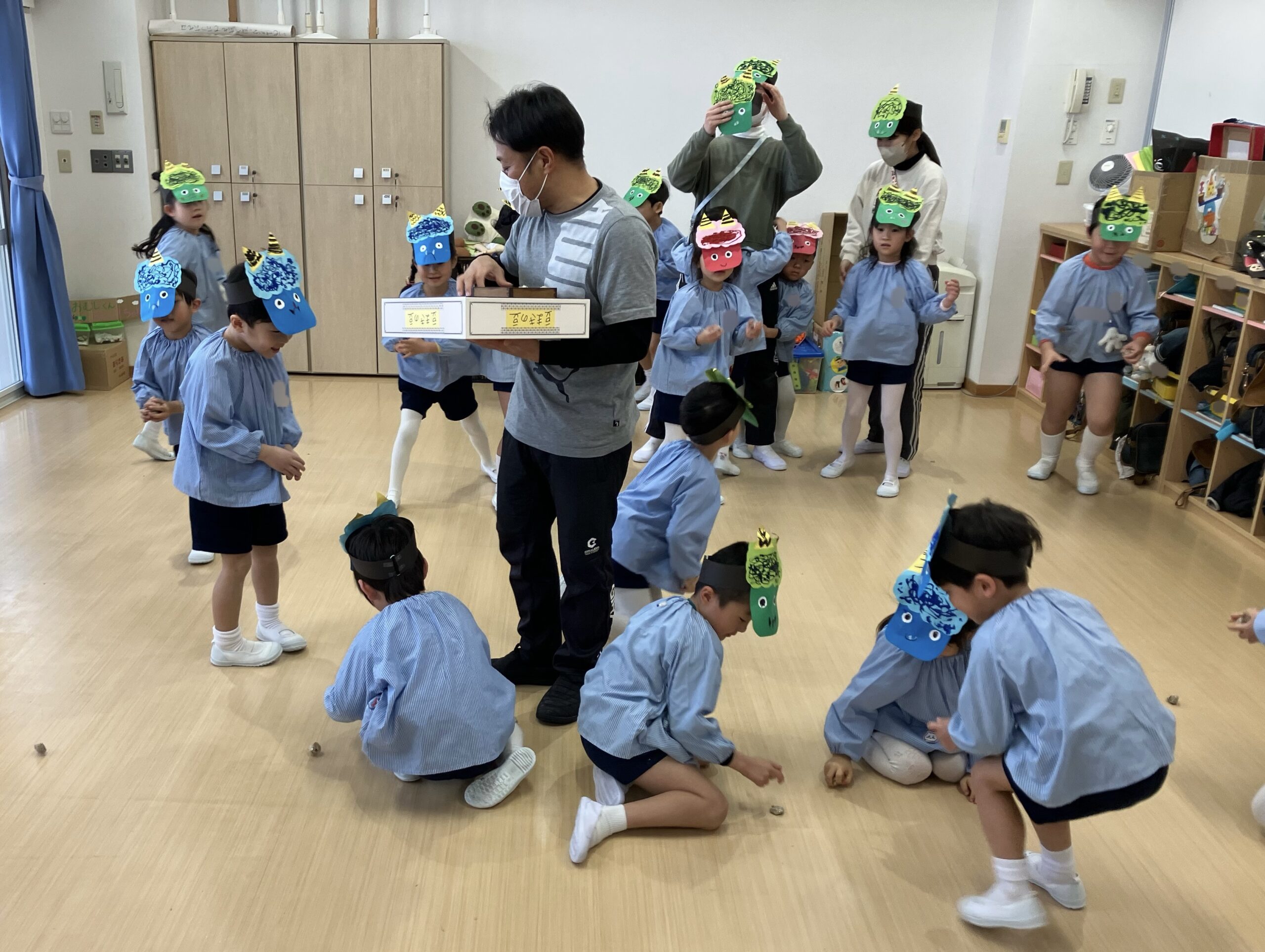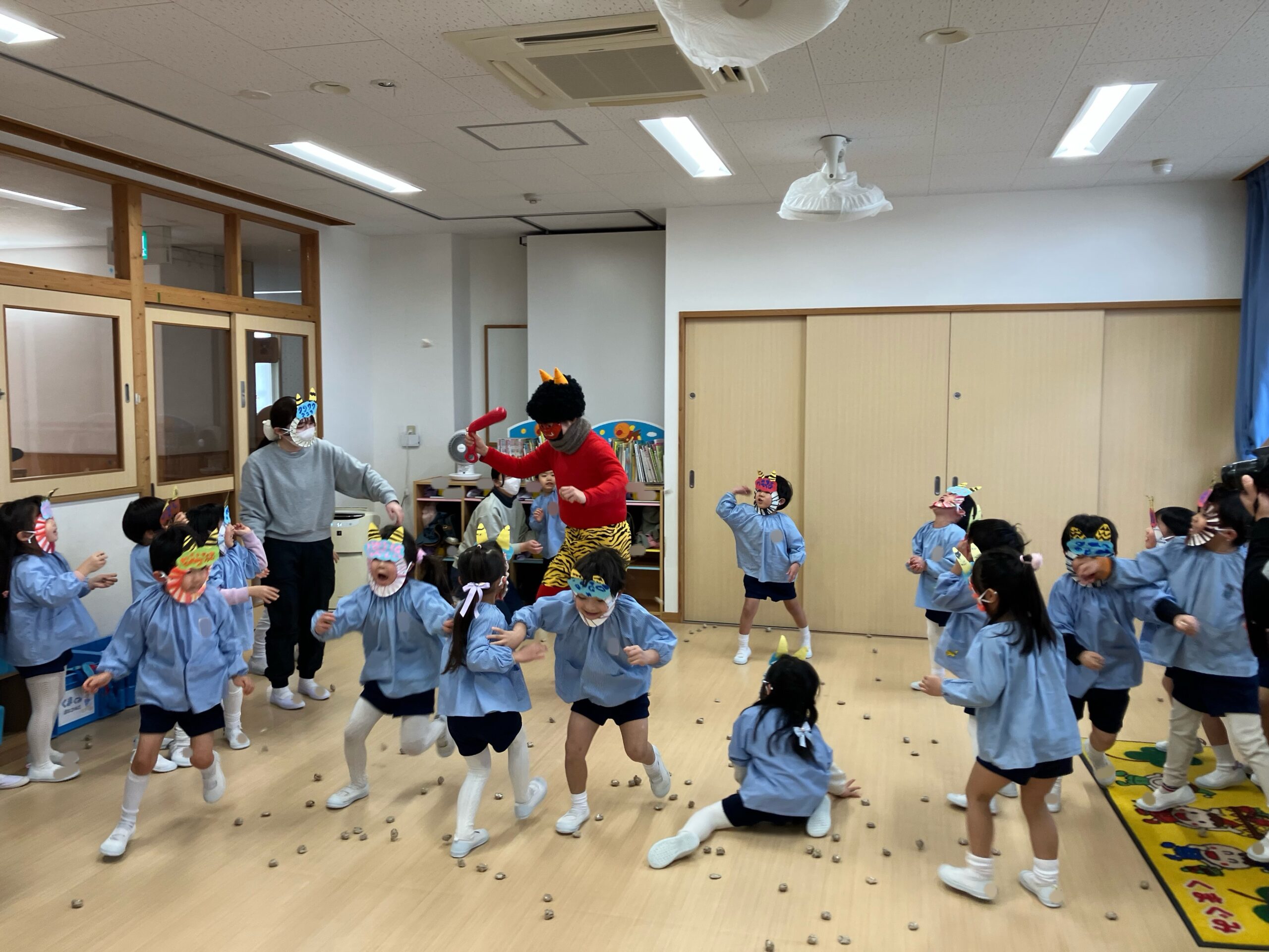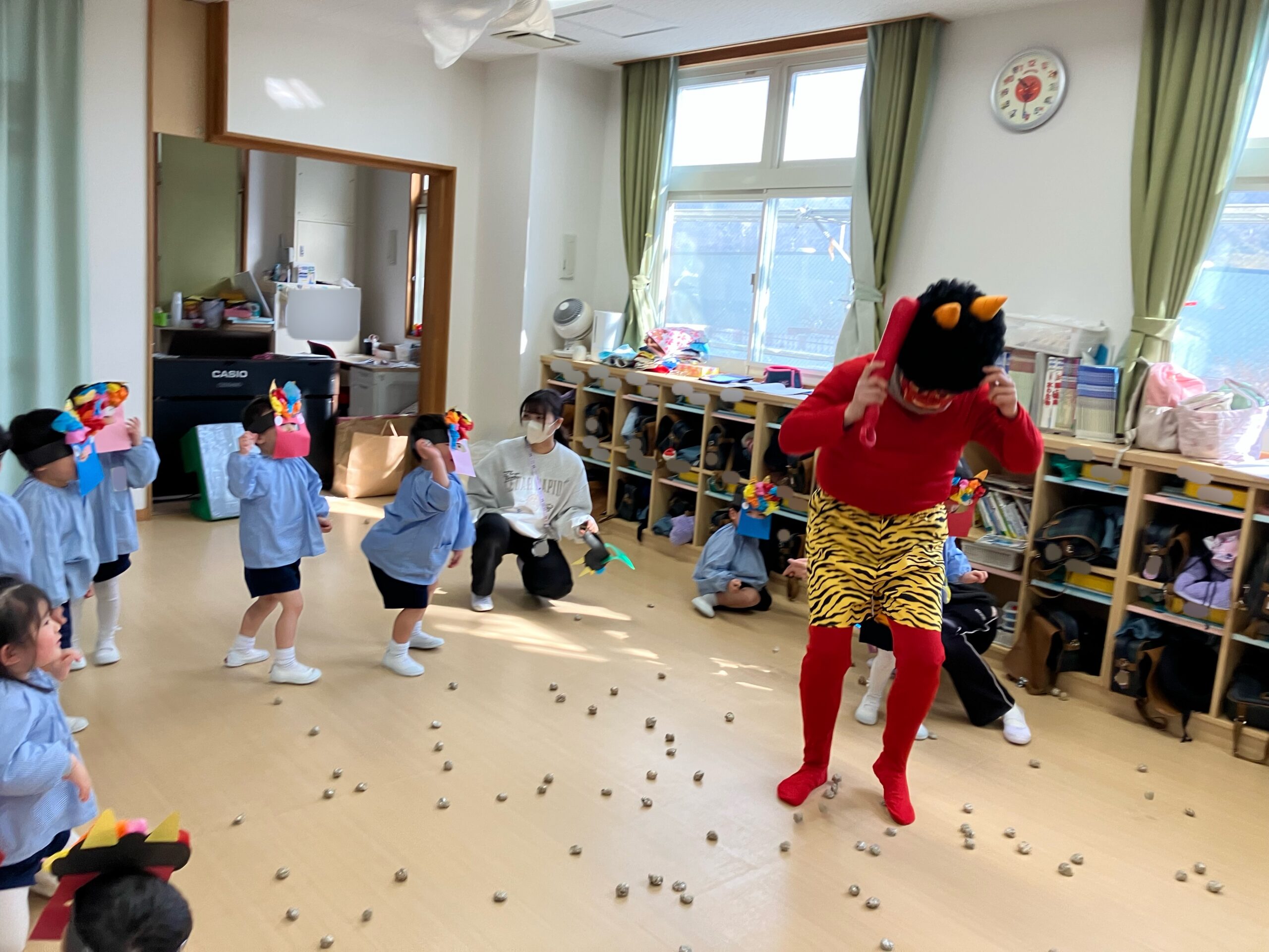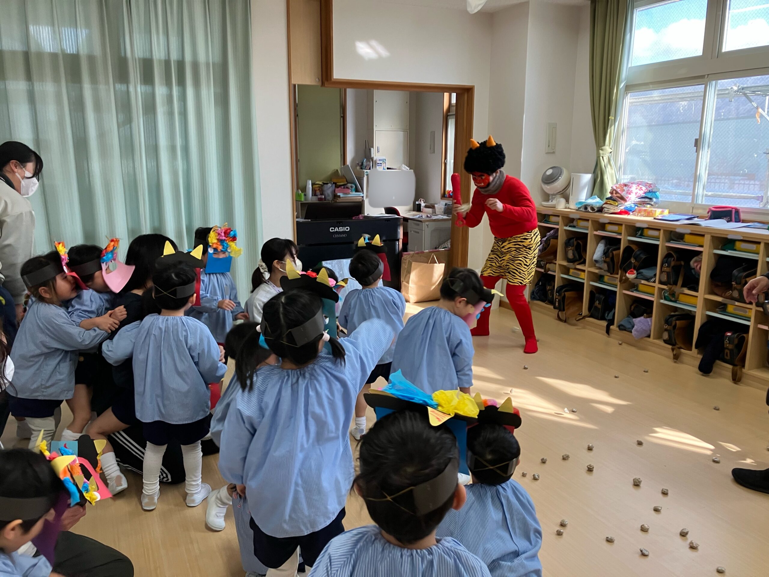 「おにはそと!ふくはうち!」と元気いっぱい豆まきをしているところに、鬼がやってきました。