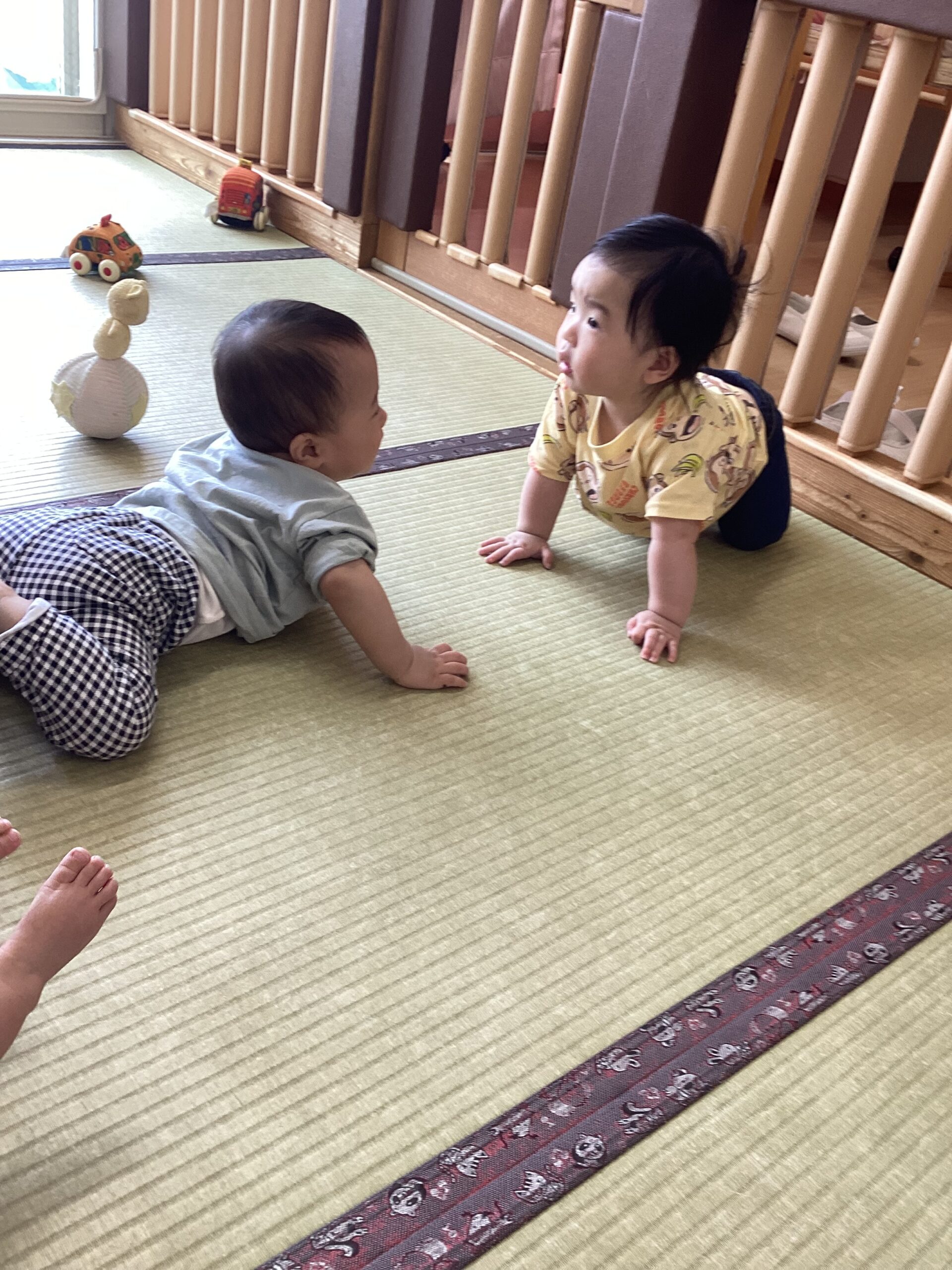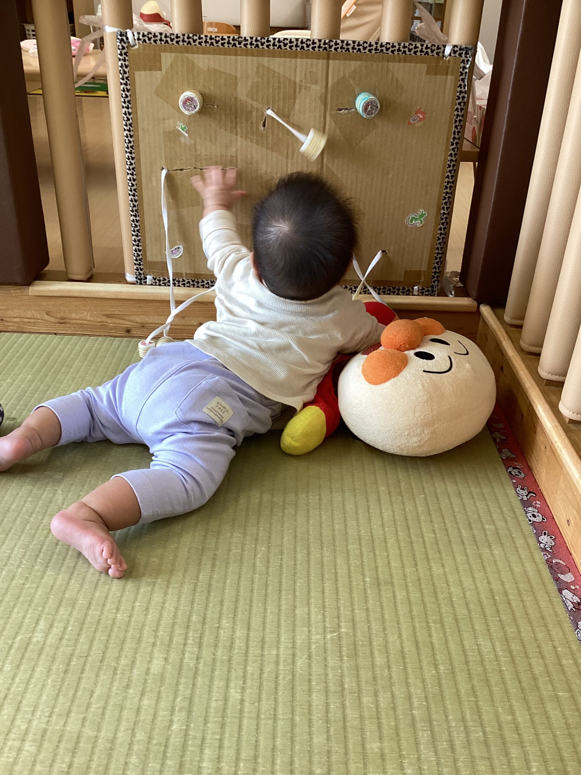 りすぐみさんは、先生の抱っこで安心したり、機嫌良く玩具遊びをして過ごしています。